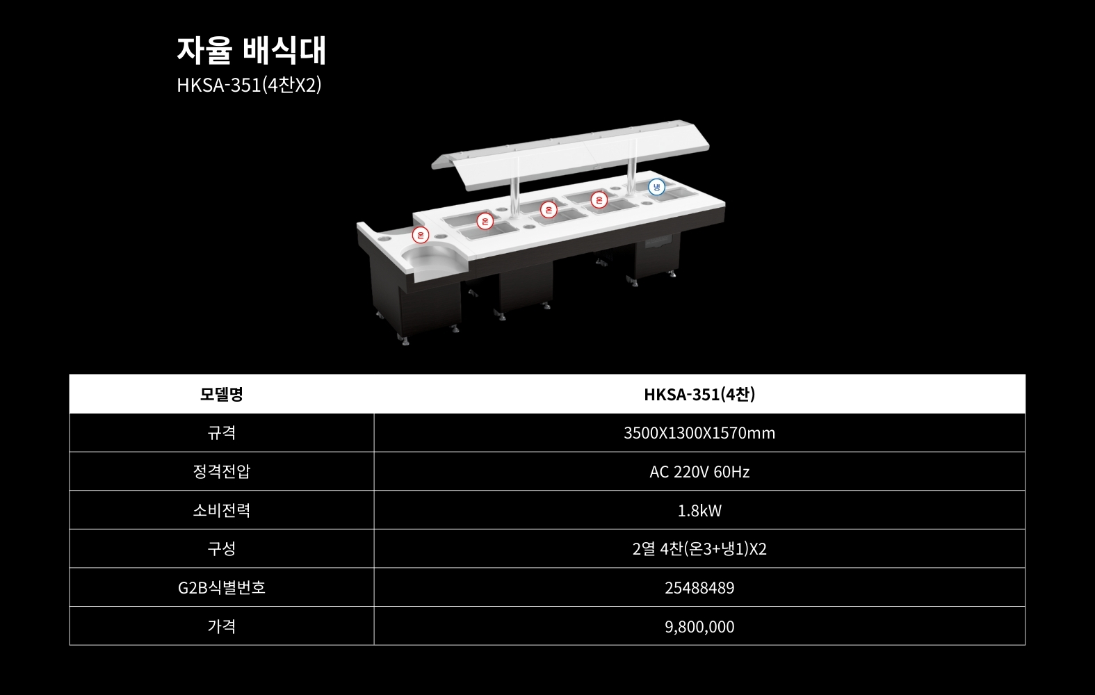 배식대 HKSA-351hbkitchen32432025-12-22T10:34:29+09:00 자율배식대학교급식배식대수저·식판배분대국배식대밥배식대보조배식대국보온운반카배식대제목학교급식배식대 HKSS-351 모델명흥부산업 자율배식대 HKSA-351판매가(VAT포함)9,800,000원조달물품식별번호25488489상품정보STS 304 스테인리스 / 인조대리석규격3500X1300X1570mm나라장터 바로가기학교장터 바로가기구매문의 바로가기Detail View