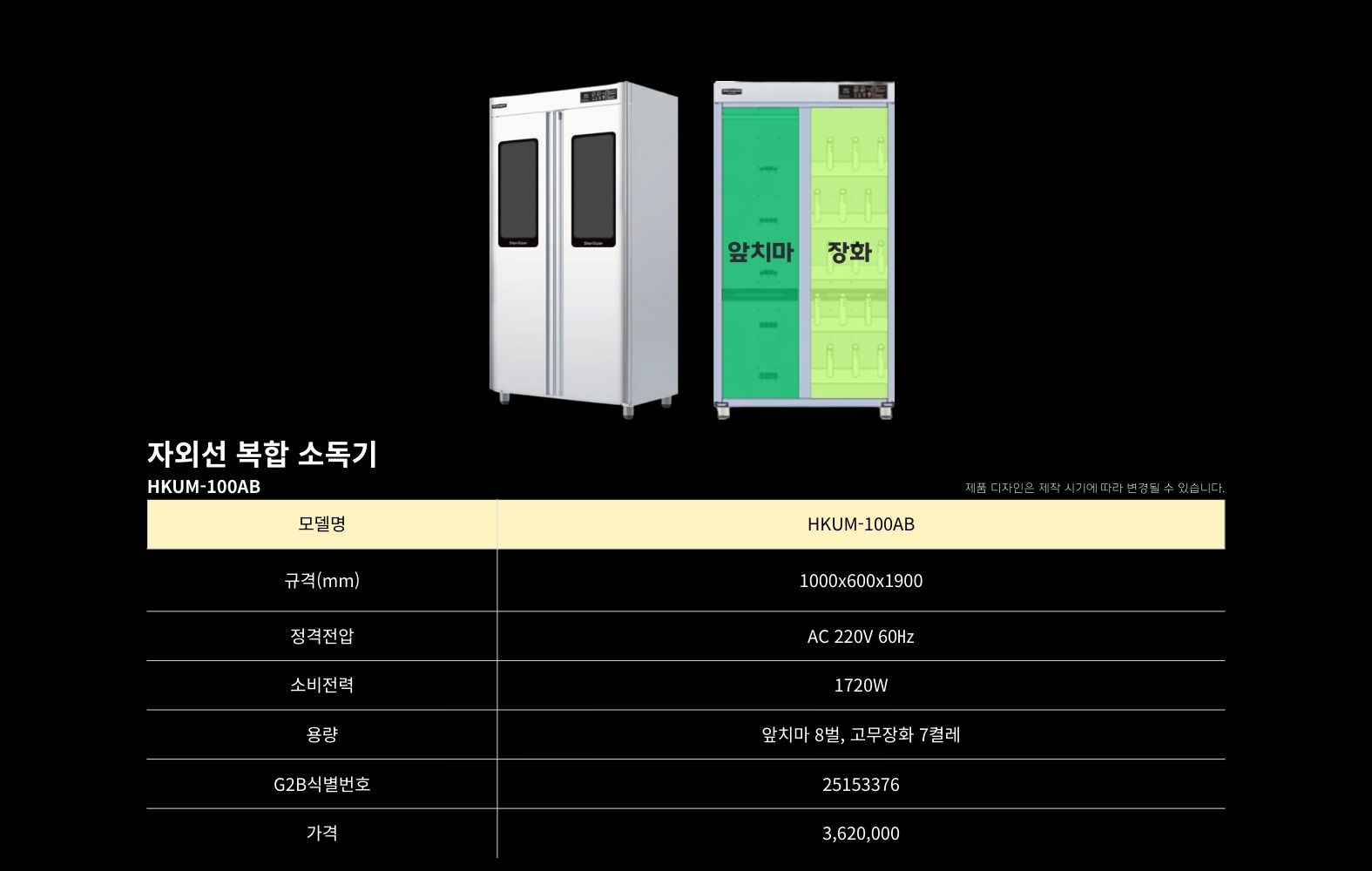 HKUM-100AB 복합소독기hbkitchen32432026-02-10T16:14:17+09:00 복합 소독기위생복 소독기앞치마 소독기고무장갑 소독기행주 소독기칼·도마 소독기장화·신발 소독기조리기구 소독기청소도구 소독기식판 소독기컵 소독기복합 소독기위생복 소독기앞치마 소독기고무장갑 소독기행주 소독기칼·도마 소독기장화·신발 소독기조리기구 소독기청소도구 소독기식판 소독기컵 소독기 복합 소독기제목HKUM-100AB 복합소독기 모델명흥부산업 복합소독기 HKUM-100AB판매가(VAT포함)3,620,000원조달물품식별번호25153376상품정보AC 220V / 1730W / 살균 / 건조 / 탈취규격1000X600X1900mm용량앞치마 8장, 장화 7켤레나라장터 바로가기학교장터 바로가기구매문의 바로가기Detail View상품정보 (Product information)제조사흥부산업(주)모델명HKUM-100ABG2B식별번호25153376규격1000X600X1900mm용량앞치마 8장, 장화 7켤레소비전력AC 220V / 1730W제조국대한민국재질스테인레스 304품질보증기간구매일로부터 1년 A/SA/S 전화번호1566-3243