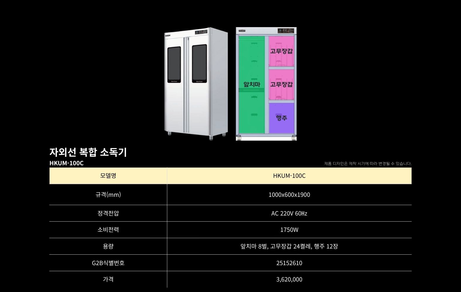 HKUM-100C 복합소독기hbkitchen32432026-02-10T15:57:24+09:00 복합 소독기위생복 소독기앞치마 소독기고무장갑 소독기행주 소독기칼·도마 소독기장화·신발 소독기조리기구 소독기청소도구 소독기식판 소독기컵 소독기복합 소독기위생복 소독기앞치마 소독기고무장갑 소독기행주 소독기칼·도마 소독기장화·신발 소독기조리기구 소독기청소도구 소독기식판 소독기컵 소독기 복합 소독기제목HKUM-100C 복합소독기 모델명흥부산업 복합소독기 HKUM-100C판매가(VAT포함)3,620,000원조달물품식별번호25152610상품정보AC 220V / 1730W / 살균 / 건조 / 탈취규격1000X600X1900mm용량앞치마 8벌, 고무장갑 25켤레, 행주 15장나라장터 바로가기학교장터 바로가기구매문의 바로가기Detail View상품정보 (Product information)제조사흥부산업(주)모델명HKUM-100CG2B식별번호25152610규격1000X600X1900mm용량앞치마 8벌, 고무장갑 25켤레, 행주 15장소비전력AC 220V / 1730W제조국대한민국재질스테인레스 304품질보증기간구매일로부터 1년 A/SA/S 전화번호1566-3243