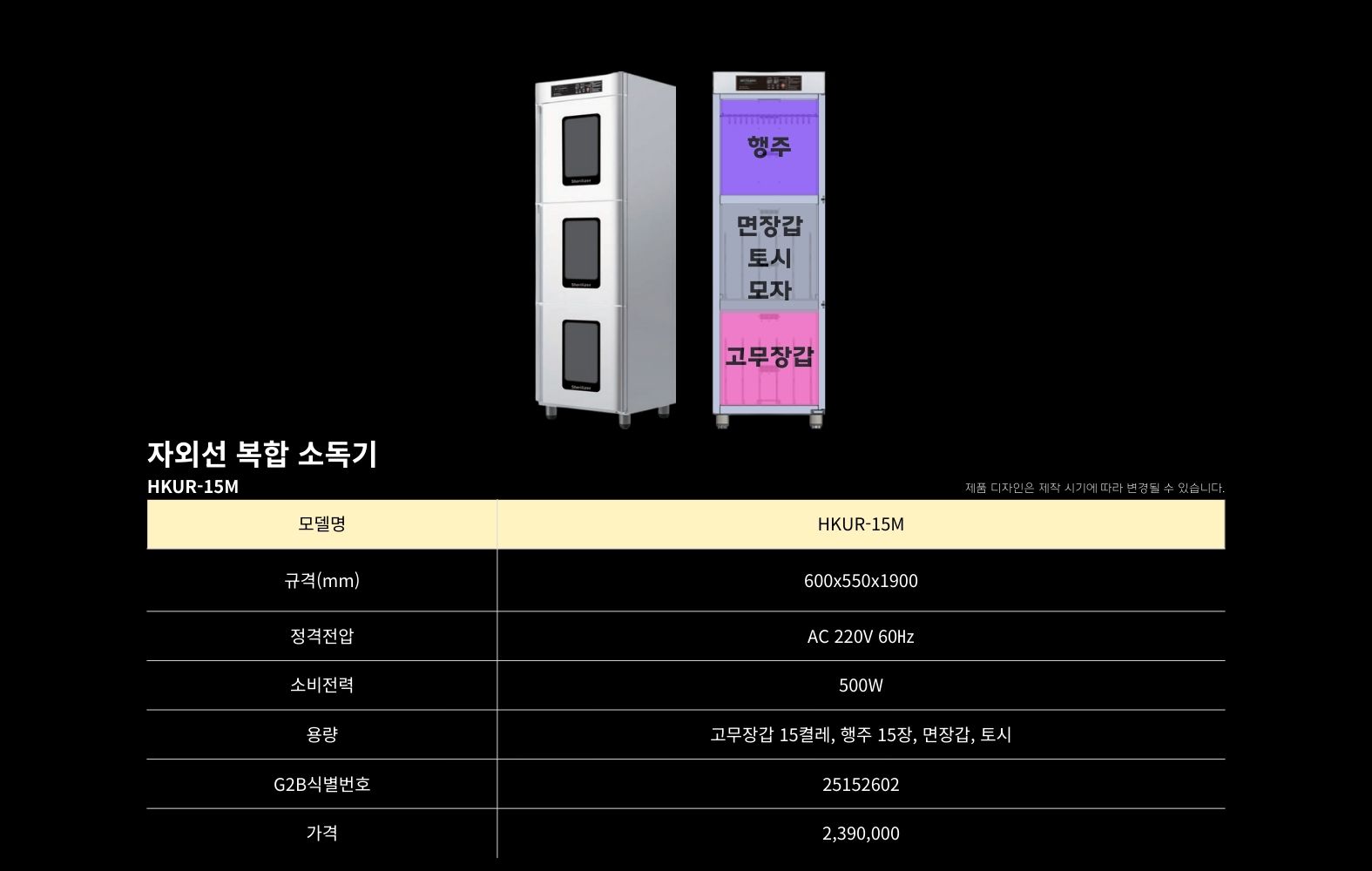 HKUR-15M 고무장갑소독기hbkitchen32432026-02-10T15:38:43+09:00 복합 소독기위생복 소독기앞치마 소독기고무장갑 소독기행주 소독기칼·도마 소독기장화·신발 소독기조리기구 소독기청소도구 소독기식판 소독기컵 소독기복합 소독기위생복 소독기앞치마 소독기고무장갑 소독기행주 소독기칼·도마 소독기장화·신발 소독기조리기구 소독기청소도구 소독기식판 소독기컵 소독기 고무장갑 소독기제목HKUR-15M 고무장갑소독기 모델명흥부산업 고무장갑소독기 HKUR-15M판매가(VAT포함)2,390,000원조달물품식별번호25152602상품정보AC 220V / 500W / 살균 / 건조 / 탈취규격600X550X1900mm용량고무장갑 15켤레, 행주 15장, 면장갑, 토시나라장터 바로가기학교장터 바로가기구매문의 바로가기Detail View상품정보 (Product information)제조사흥부산업(주)모델명HKUR-15MG2B식별번호25152602규격600X550X1900mm용량고무장갑 15켤레, 행주 15장, 면장갑, 토시소비전력AC 220V / 500W제조국대한민국재질스테인레스 304품질보증기간구매일로부터 1년 A/SA/S 전화번호1566-3243