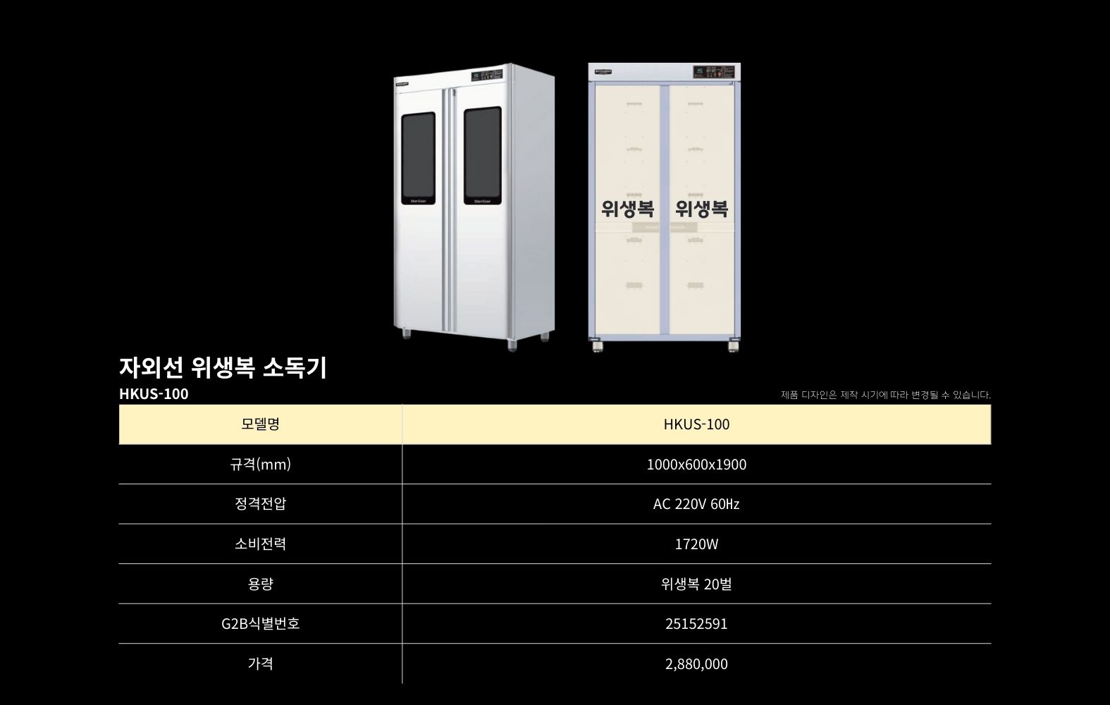 HKUS-100 위생복소독기hbkitchen32432026-02-11T14:37:04+09:00 복합 소독기위생복 소독기앞치마 소독기고무장갑 소독기행주 소독기칼·도마 소독기장화·신발 소독기조리기구 소독기청소도구 소독기식판 소독기컵 소독기복합 소독기위생복 소독기앞치마 소독기고무장갑 소독기행주 소독기칼·도마 소독기장화·신발 소독기조리기구 소독기청소도구 소독기식판 소독기컵 소독기 위생복 소독기제목HKUS-100 위생복소독기 모델명HKUS-100 위생복소독기판매가(VAT포함)2,380,000원조달물품식별번호25152591상품정보AC 220V / 1730W / 살균 / 건조 / 탈취규격1000X600X1900mm용량위생복 12벌나라장터 바로가기학교장터 바로가기구매문의 바로가기Detail View상품정보 (Product information)제조사흥부산업(주)모델명HKUS-100 위생복소독기G2B식별번호25152591규격1000X600X1900mm용량위생복 12벌소비전력AC 220V / 1730W제조국대한민국재질스테인레스 304품질보증기간구매일로부터 1년 A/SA/S 전화번호1566-3243